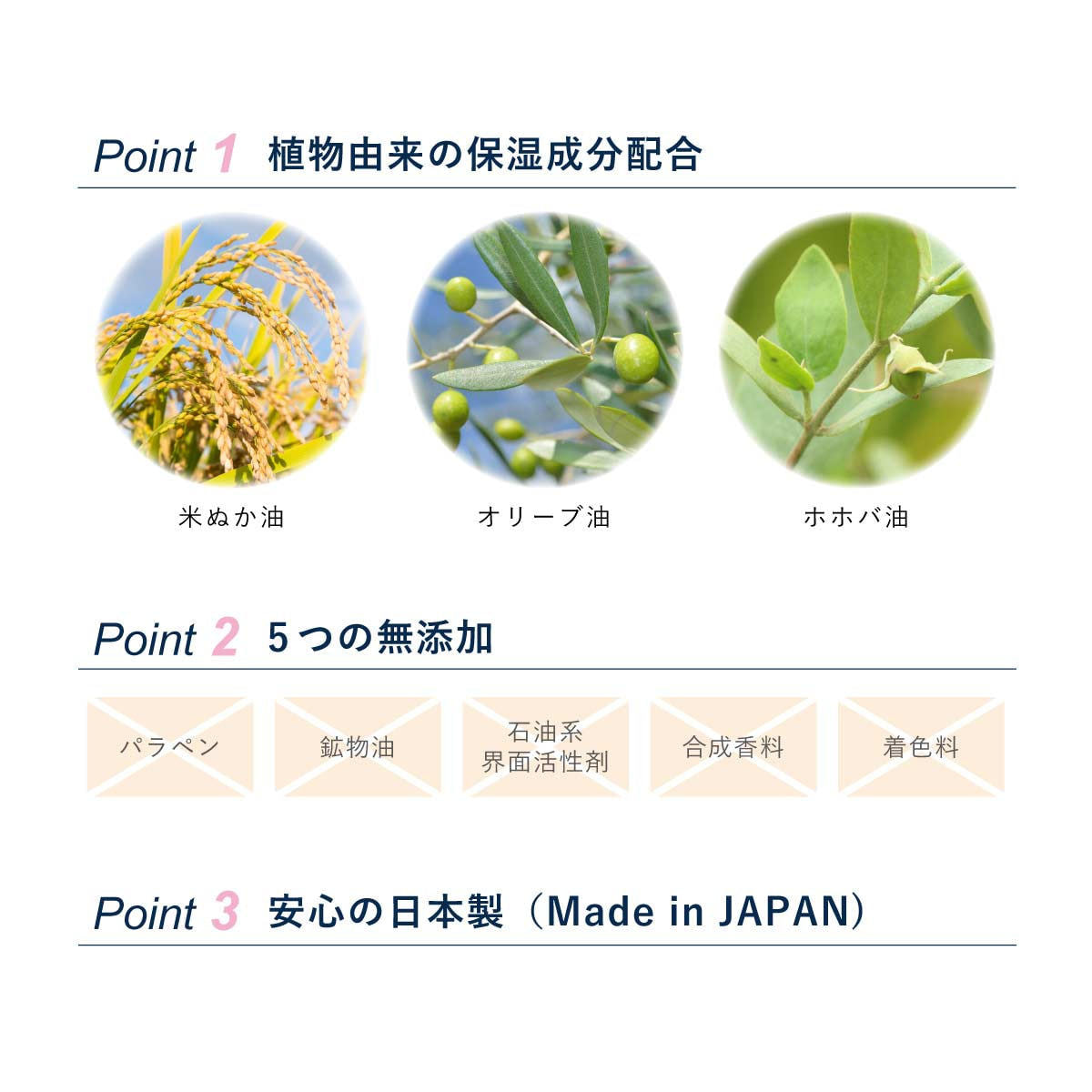 ・植物由来の保湿成分配合:米ぬか油、オリーブ油、ホホバ油