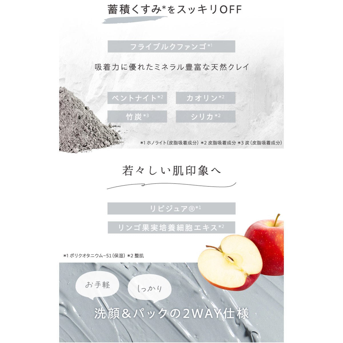 吸着力に優れたミネラル豊富な天然クレイで、汚れもスッキリ。